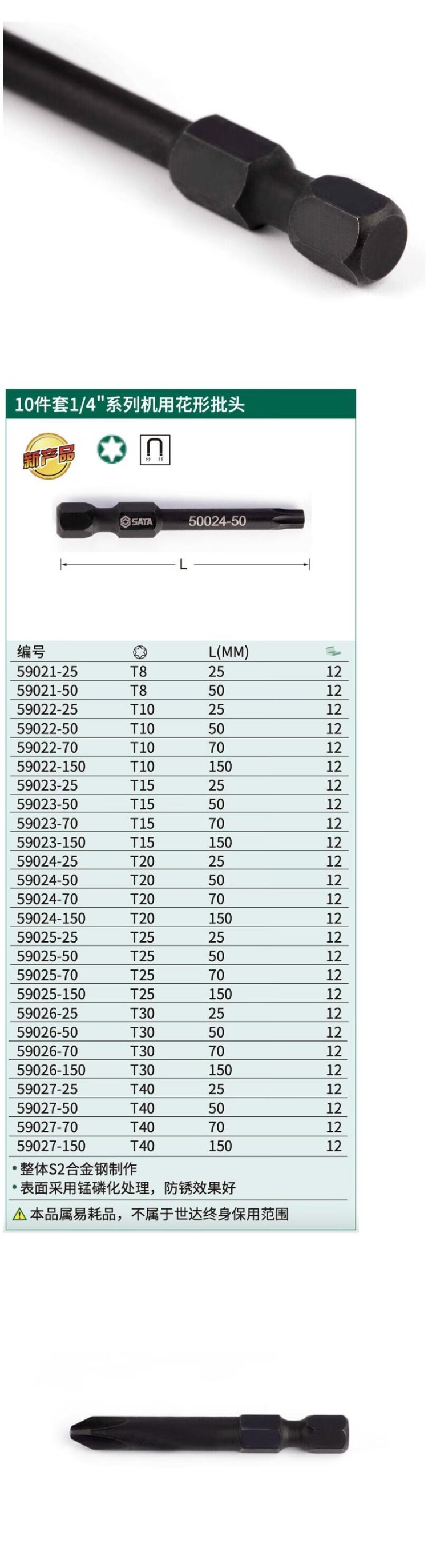 世达 10件套1/4" 1/4寸系列25MM长机用花形批头T10“即将下市,售完为止” 59022-25