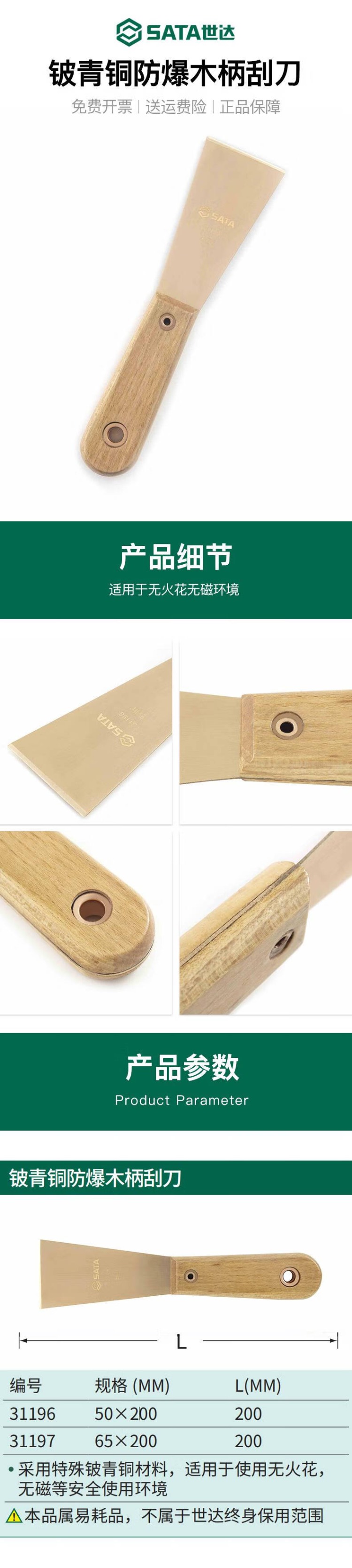 世达 铍青铜防爆木柄刮刀65x200MM 31197
