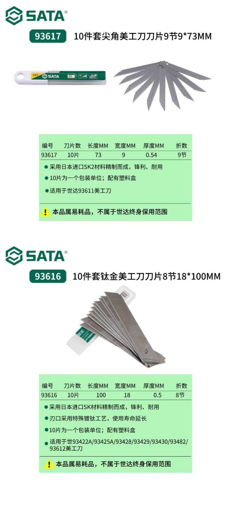 商品名称: 10 件套尖角美工刀刀片 9 节 9*73MM
